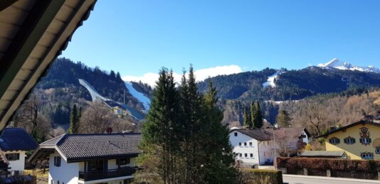 Aufgenommen aus dem Denkmalhaus in Partenkirchen, Mittenwalderstraße 53. Ursprünglich 1912 als Landhaus für Freifrau Baronin von Renner erbaut.